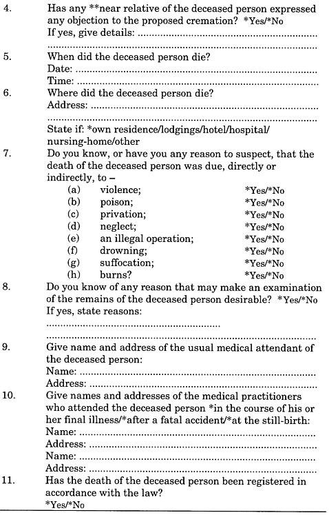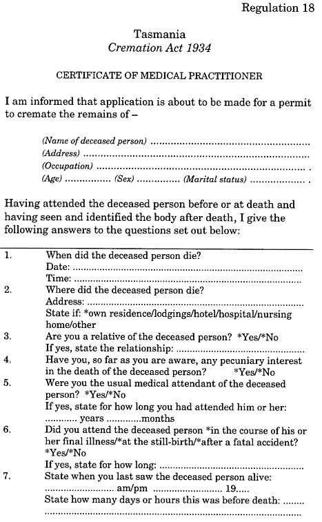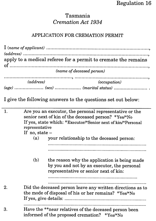 (1) Any person may apply to a medical referee for a permit authorising the cremation of the remains of a deceased person.(2) An application for a cremation permit is to be (a) in accordance with Form 1 ; and(b) accompanied by a medical practitioner's certificate, confirmatory certificate and, if applicable, a post-mortem certificate, except as provided for in regulation 26(1)(a) ; and(c) accompanied by the Schedule fee.(3) An applicant who is not an executor, the personal representative or the senior next of kin of the deceased person is to state in the application why the application is not being made by one of those persons.