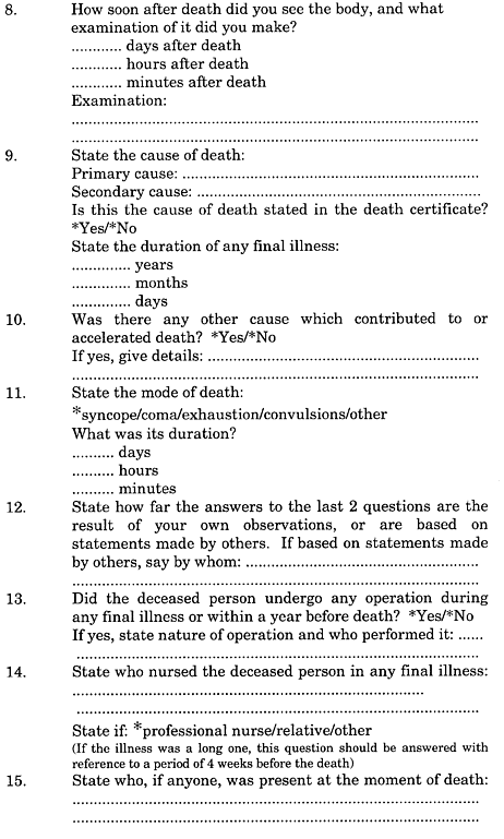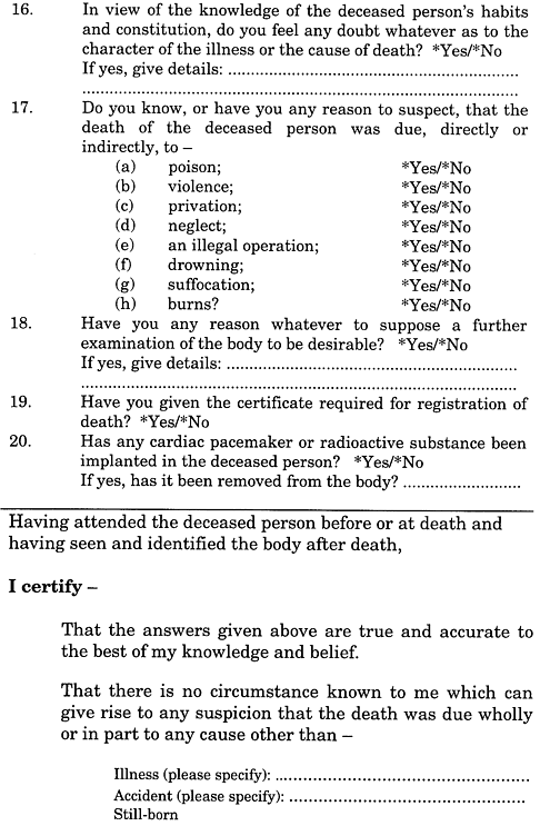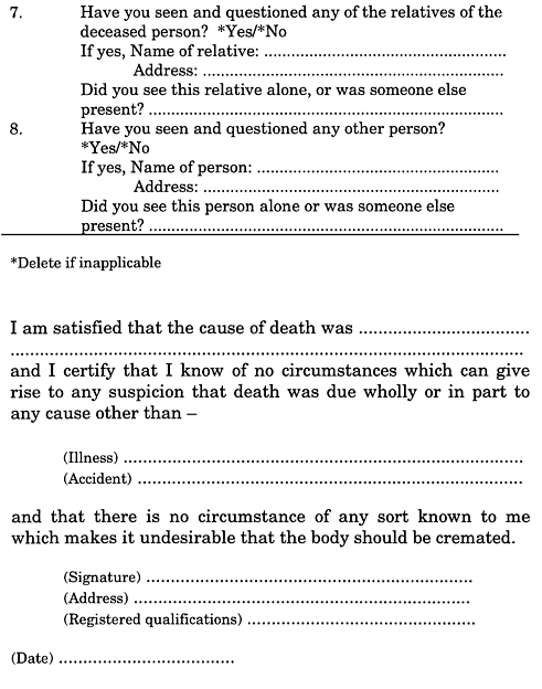 (1) A medical practitioner's certificate is to be issued by a medical practitioner who (a) attended (i) the deceased person in the course of that person's final illness or after a fatal accident; or(ii) the birth of a still-born child; and(b) is able to certify as to the cause of death of that deceased person.(2) A medical practitioner's certificate is to (a) be completed in accordance with Form 2 ; and(b) state if any cardiac pacemaker or radioactive substance has been implanted in the deceased person and, if so, if it has been removed from the body.(3) A medical referee who personally investigated the cause of death may issue a medical practitioner's certificate.(4) A medical practitioner may not issue a medical practitioner's certificate in respect of the birth of a still-born child if the medical practitioner is a relative of the child.