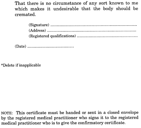 (1) In determining an application for a cremation permit, a medical referee is to be satisfied that (a) the application is made by (i) an executor or the personal representative of the deceased person; or(ii) the senior next of kin of the deceased person; or(iii) any other proper person; and(b) the certificates comply with Division 3 of Part 3 ; and(c) the inquiry made by any person issuing a certificate has been adequate.(2) Subject to subregulation (3) , a cremation permit may only be issued if (a) the death of the deceased person has been registered in accordance with the law; or(b) a medical practitioner's certificate and a confirmatory certificate have been issued; or(c) a certificate of burial has been issued by a coroner.(3) A cremation permit may not be issued if (a) it appears that the deceased person died, directly or indirectly, due to (i) poison; or(ii) violence; or(iii) an illegal operation; or(iv) privation; or(v) neglect; or(vi) drowning; or(vii) suffocation; or(viii) burns; or(b) the medical referee is aware of any suspicious circumstances surrounding the death; or(c) the medical referee is unsatisfied as to any matter referred to in subregulation (1) ; or(d) in relation to a death that is the subject of an inquest or investigation under the Coroners Act 1995 , the coroner has not issued a certificate of burial; or(e) any cardiac pacemaker or radioactive substance implanted in the deceased person has not been removed from the body.