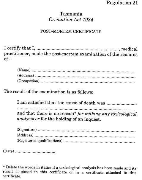 (1) Following any post-mortem examination, a certificate is to be issued in respect of that examination by the medical practitioner who conducted the post-mortem examination.(2) A post-mortem certificate is to be in accordance with Form 4 .(3) A medical practitioner may not issue a post-mortem certificate if the medical practitioner is a relative of the deceased person.