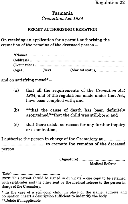 (1) Except as provided in regulations 24 and 25 , only a medical referee may issue a permit authorising the cremation of the remains of a deceased person.(2) A cremation permit is to be in accordance with Form 5 .