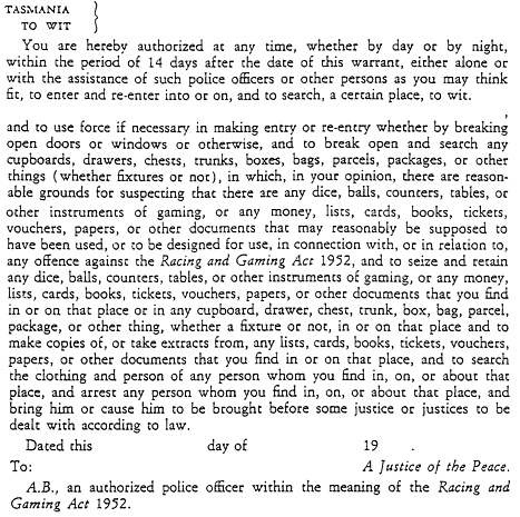 (1) On complaint by an authorised police officer stating that, in his opinion, there are reasonable grounds for suspecting that in or on a place, whether a public place or not (other than betting premises), a person has committed, or is committing, or is about to commit, an offence against this Act, a justice may issue to that police officer a warrant in or to the effect of the form in Schedule III .(2) [Section 107 Subsection (2) amended by No. 18 of 1953, s. 8 ]An authorised police officer to whom a warrant under this section is issued may (a) within the period of 14 days after the date of the warrant, either alone, or with the assistance of such police officers or other persons as he thinks fit, at any time, whether by day or by night, enter or re-enter into or on, and search, the place to which the warrant relates;(b) use force if necessary in making entry or re-entry, whether by breaking open doors or windows, or otherwise;(c) break open and search any cupboards, drawers, chests, trunks, boxes, bags, parcels, packages, or other things, whether fixtures or not, in which, in his opinion, there are reasonable grounds for suspecting that there are any dice, balls, counters, tables, or other instruments of gaming, or any money, lists, cards, books, tickets, vouchers, papers, or other documents that may reasonably be supposed to have been used, or to be designed for use, in connection with, or in relation to, any offence against this Act;(d) seize and retain any dice, balls, counters, tables, or other instruments of gaming, and any money, lists, cards, books, tickets, vouchers, papers, or other documents that he finds in or on that place, or in any cupboard, drawer, chest, trunk, box, bag, parcel, package, or other thing therein or thereon, whether a fixture or not, or make copies of, or take extracts from, any lists, cards, books, tickets, vouchers, papers, or other documents that he so finds; and(e) search the clothing and person of any person whom he finds in, on, or about that place, and arrest any person whom he finds in, on, or about that place and bring him or cause him to be brought before some justice or justices to be dealt with according to law.(3) Any dice, balls, counters, tables, or other instruments of gaming, and any money, lists, cards, books, tickets, vouchers, papers, or other documents that are seized by an authorised police officer in pursuance of this section, and any copies of, or extracts from, any lists, cards, books, tickets, vouchers, papers, or other documents that are made or taken by an authorised police officer pursuant to this section, may be used in evidence in any proceedings that may be taken against any person in respect of any offence alleged to have been committed by that person, and the onus of proving that the dice, balls, counters, tables, or other instruments of gaming, or the money, lists, cards, books, tickets, vouchers, papers, or other documents do not relate, or are not connected with, any act that constitutes an offence against this Act shall lie on the person charged with that offence.