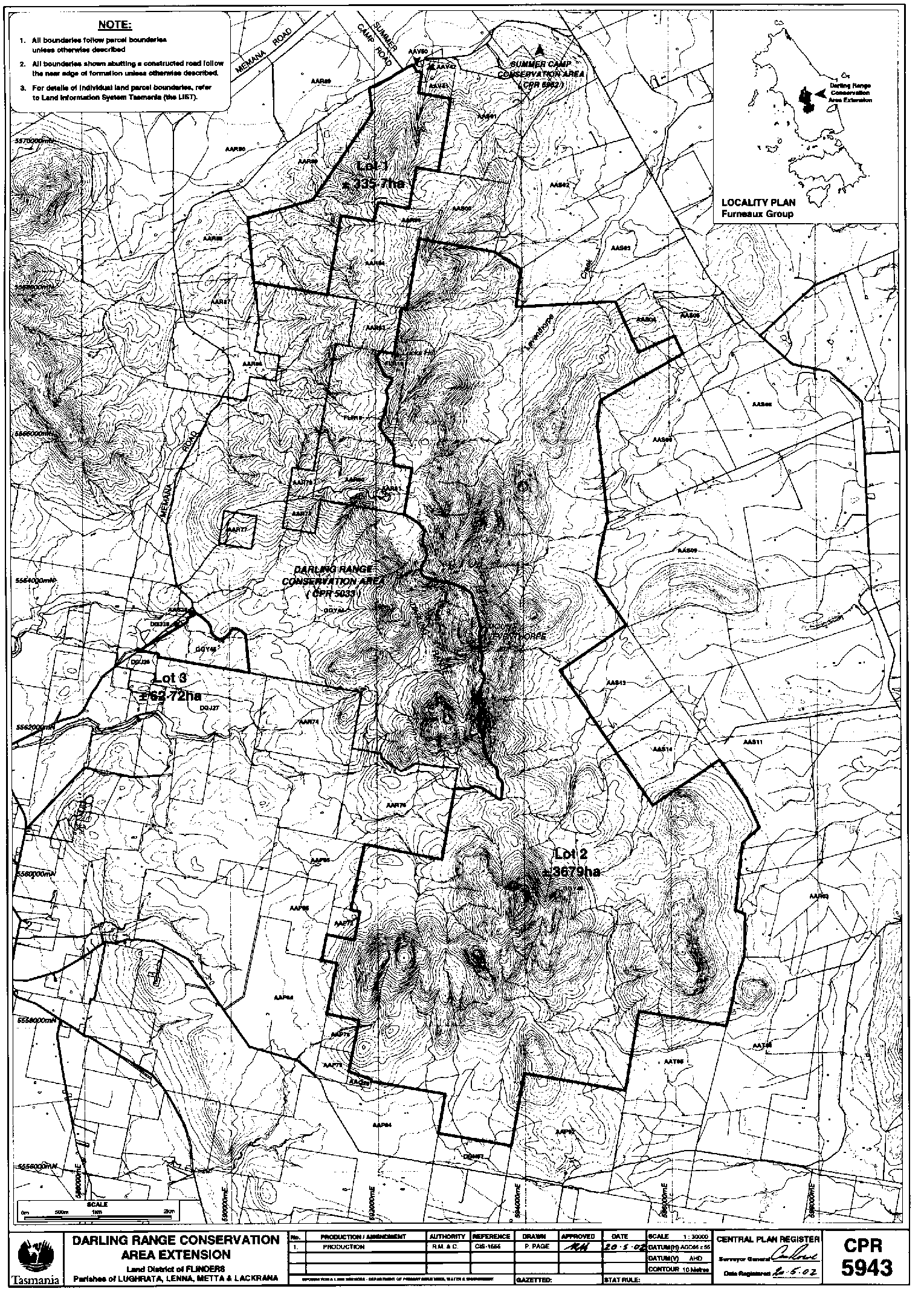 PART 9 - Darling Range Conservation AreaAll that land comprising about 4 077.42 hectares shown as Lots 1, 2, and 3 and bounded as indicated by heavy black lines on Plan 5943 in the Central Plan Register, a reduced copy of which is included by way of illustration only, in Part 10 of Schedule 2 to this proclamation.