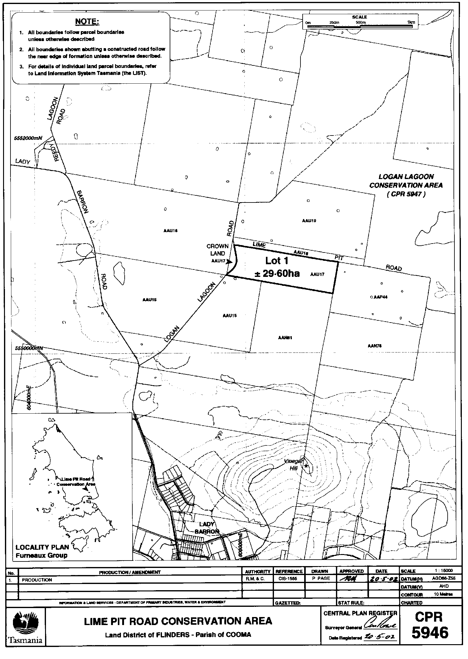 PART 5 - Lime Pit Road Conservation AreaAll that land comprising about 29.6 hectares shown bounded as indicated by a heavy black line on Plan 5946 in the Central Plan Register, a reduced copy of which is included by way of illustration only, in Part 6 of Schedule 2 to this proclamation.