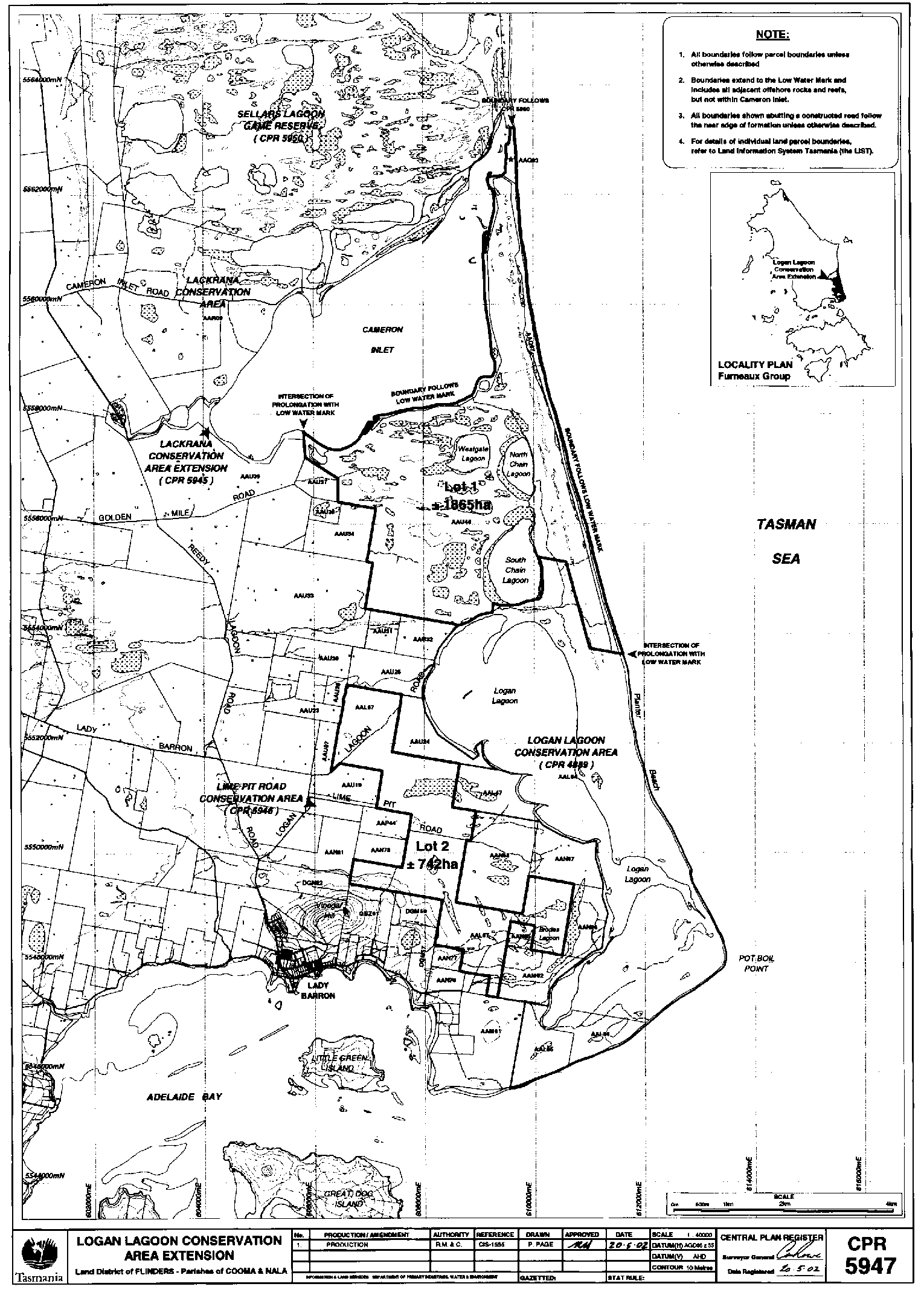 PART 4 - Logan Lagoon Conservation AreaAll that land comprising about 2 607 hectares shown as Lots 1 and 2 and bounded as indicated by heavy black lines on Plan 5947 in the Central Plan Register, a reduced copy of which is included by way of illustration only, in Part 5 of Schedule 2 to this proclamation.