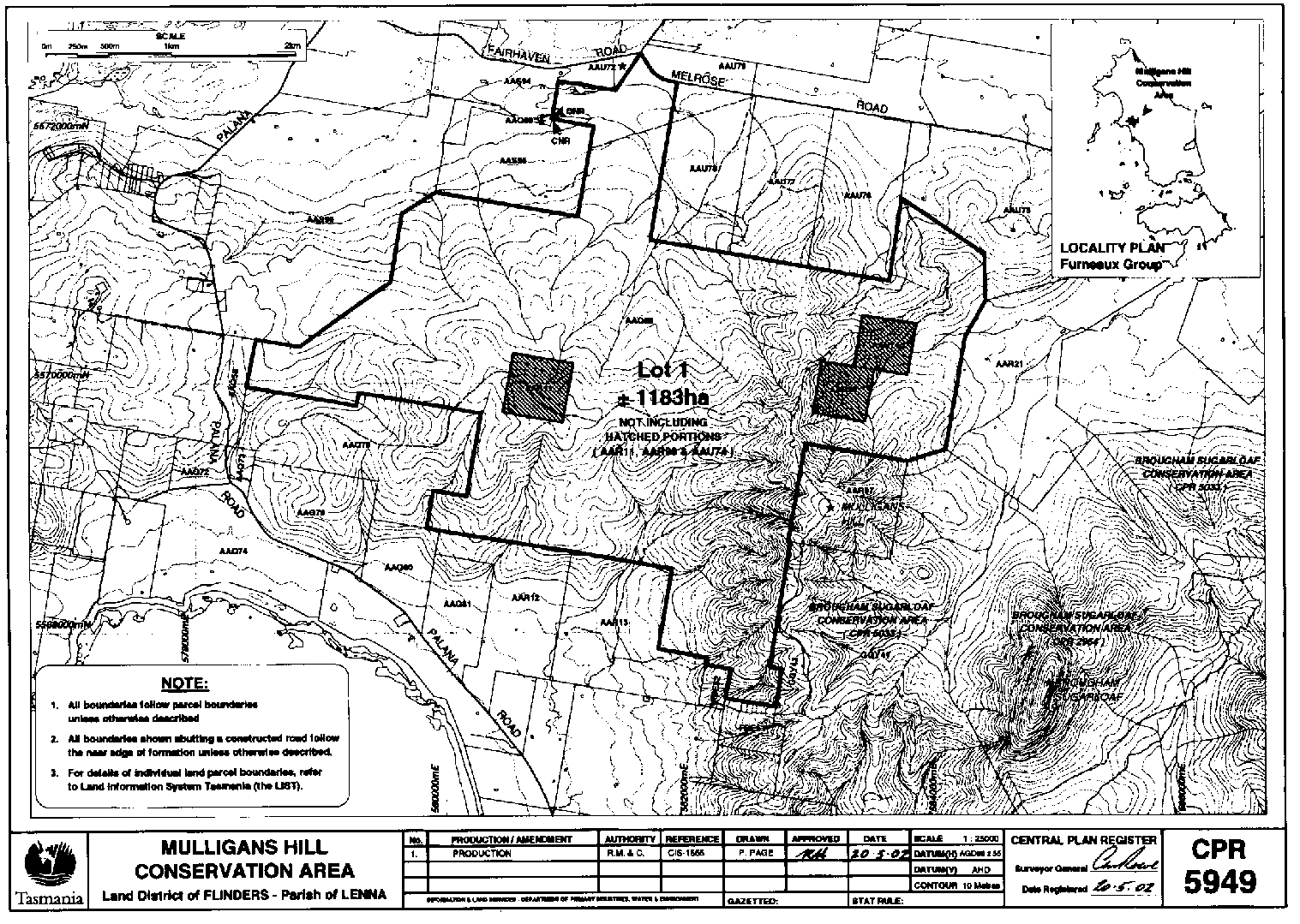 PART 7 - Mulligans Hill Conservation AreaAll that land comprising about 1 183 hectares shown bounded as indicated by a heavy black line on Plan 5949 in the Central Plan Register, a reduced copy of which is included by way of illustration only, in Part 8 of Schedule 2 to this proclamation.