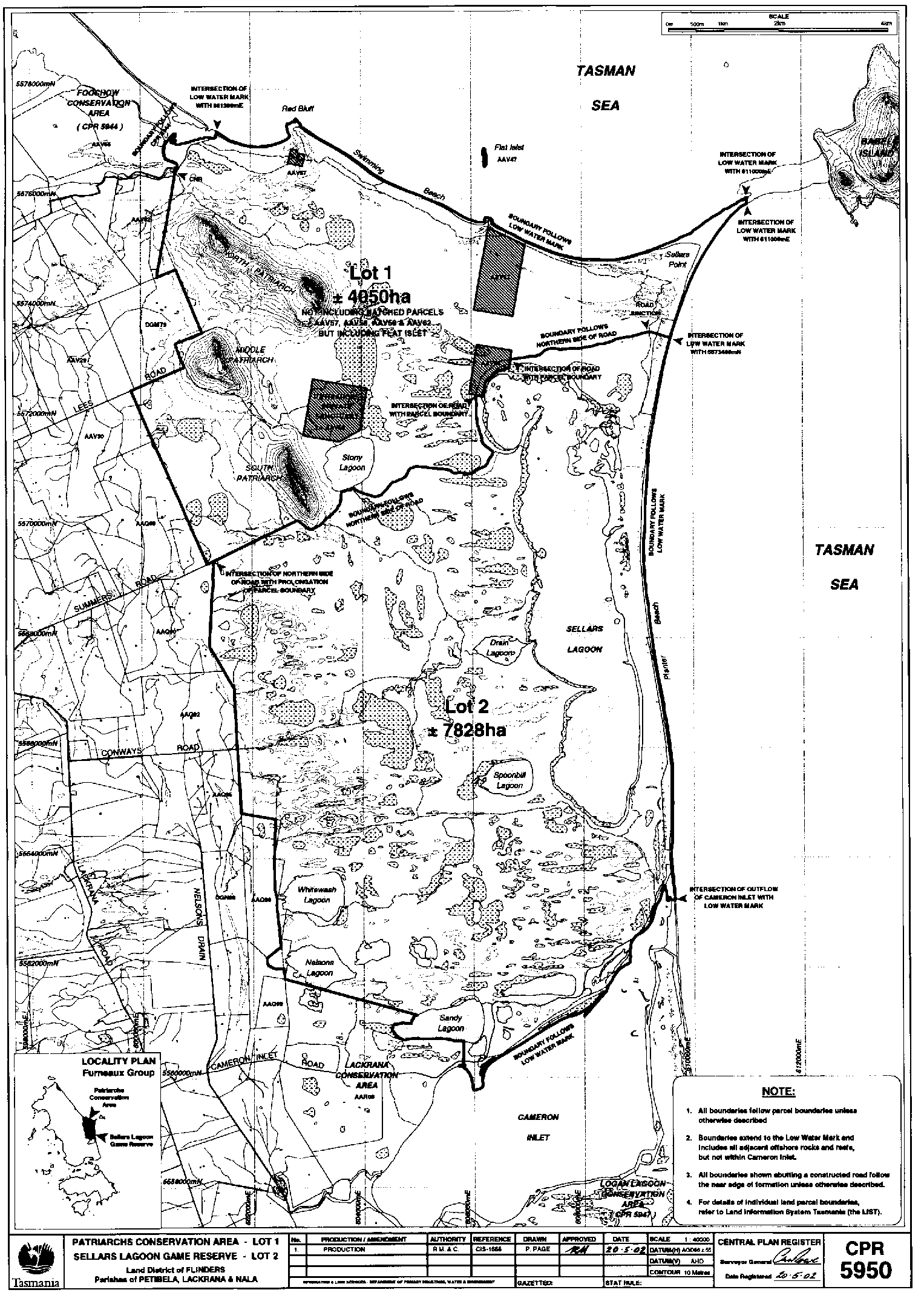 PART 1 - Patriarchs Conservation AreaAll that land comprising about 4 050 hectares shown as Lot 1 and bounded as indicated by a heavy black line on Plan 5950 in the Central Plan Register, a reduced copy of which is included by way of illustration only, in Part 2 of Schedule 2 to this proclamation.