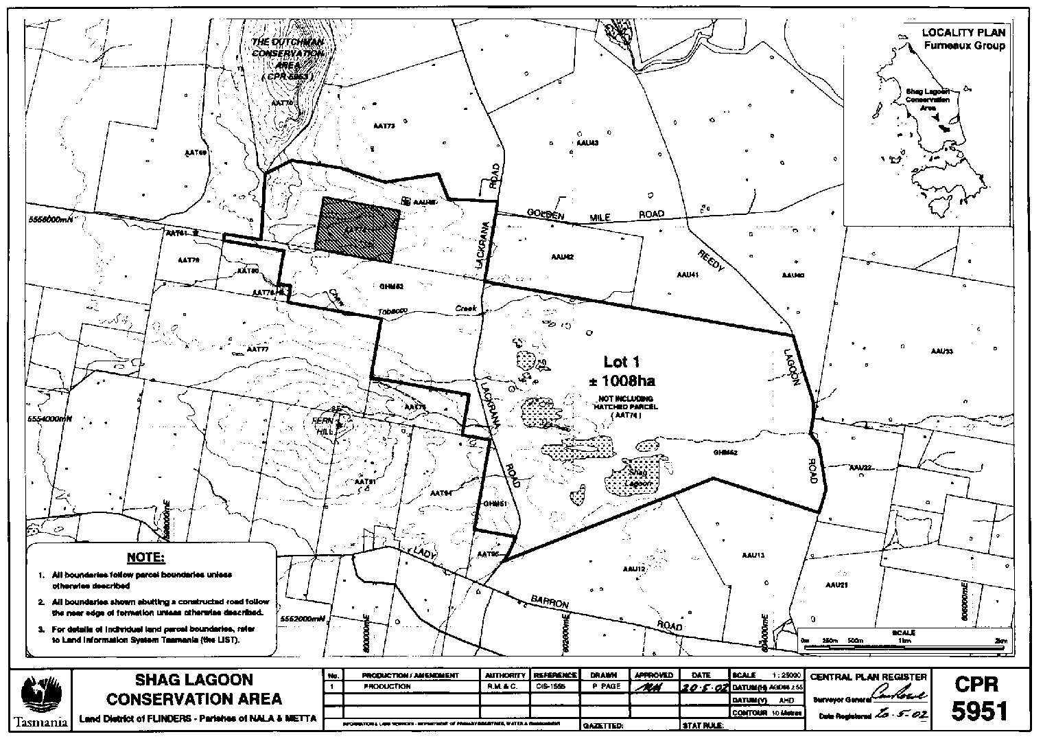 PART 6 - Shag Lagoon Conservation AreaAll that land comprising about 1 008 hectares shown bounded as indicated by a heavy black line on Plan 5951 in the Central Plan Register, a reduced copy of which is included by way of illustration only, in Part 7 of Schedule 2 to this proclamation.