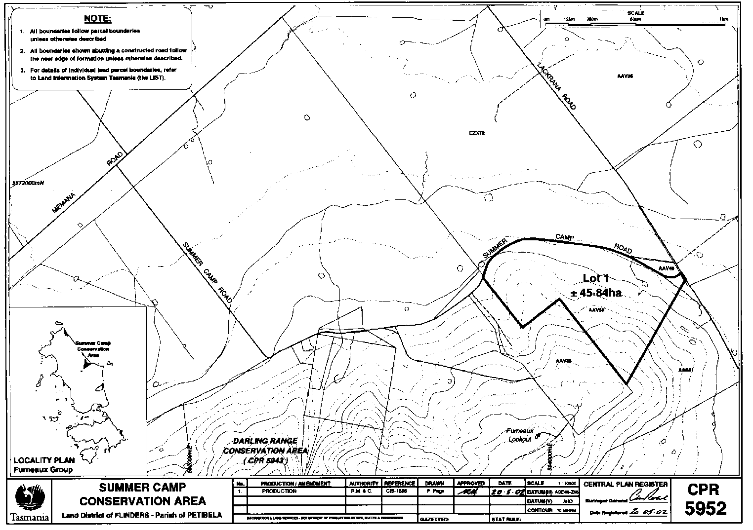 PART 8 - Summer Camp Conservation AreaAll that land comprising about 45.84 hectares shown bounded as indicated by a heavy black line on Plan 5952 in the Central Plan Register, a reduced copy of which is included by way of illustration only, in Part 9 of Schedule 2 to this proclamation.