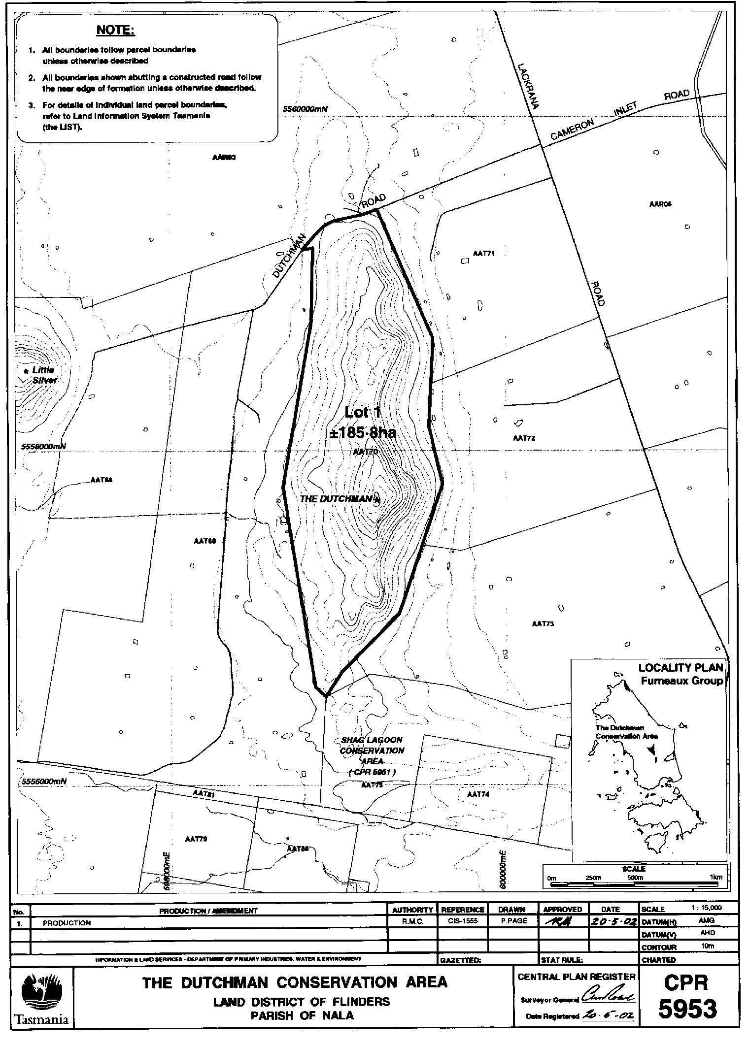 PART 10 - The Dutchman Conservation AreaAll that land comprising about 185.8 hectares shown bounded as indicated by a heavy black line on Plan 5953 in the Central Plan Register, a reduced copy of which is included by way of illustration only, in Part 11 of Schedule 2 to this proclamation.