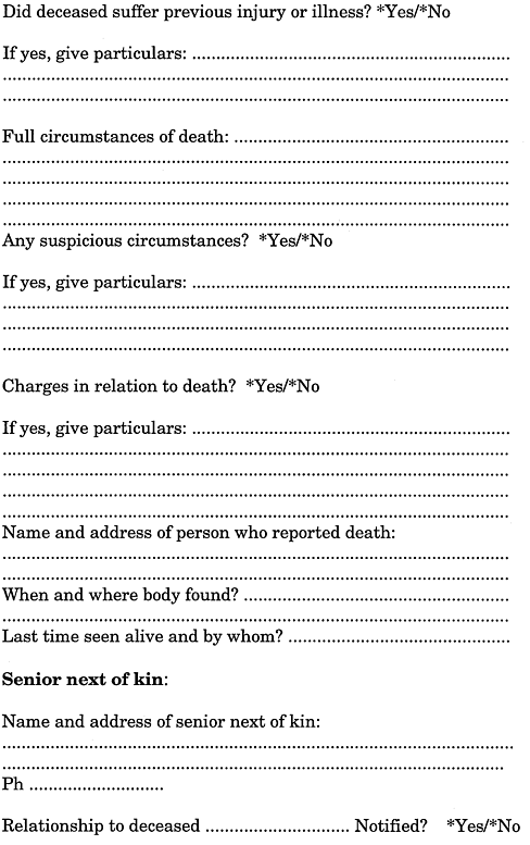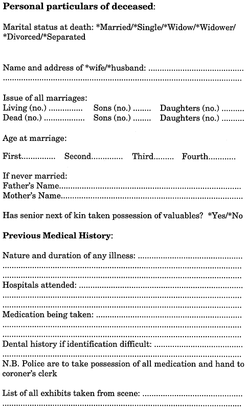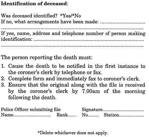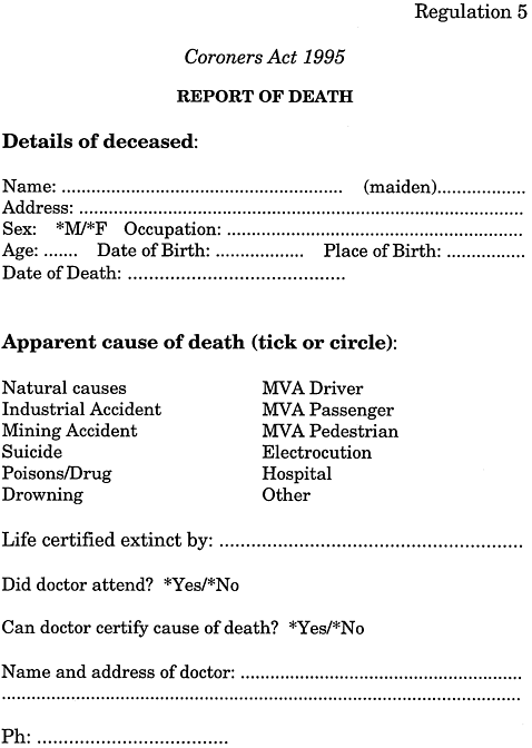 (1) A person may report a death by telephone, facsimile or other similar means of communication.(2) Within 24 hours after a person reports a death, the person is to provide the coroner or police officer to whom the death was reported with the particulars required by Form 1 .
