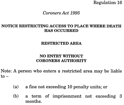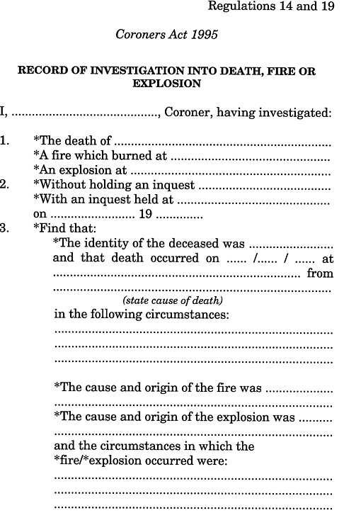 (1) In these regulations Act means the Coroners Act 1995 ;authorised person means a person authorised by a coroner for the purposes of section 59(3) of the Act;court means the Magistrates Court (Coronial Division);deposition includes (a) a written proof of evidence prepared by a witness; and(b) any examination of the witness in relation to that proof;exhumation order means an order under section 39 of the Act for the exhumation of the body of a deceased person;General Conditions of Service Award means the General Conditions of Service Award in force under the Industrial Relations Act 1984 ;oral evidence includes any deposition or affidavit read to the court;transcriber means a person who records or makes a transcript from a recording of any oral evidence given at an inquest.(2) In these regulations a reference to a form is a reference to a form in Schedule 1 .