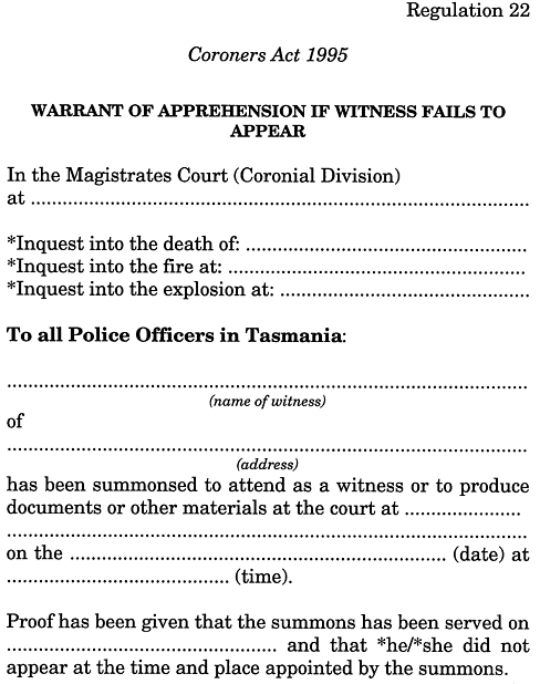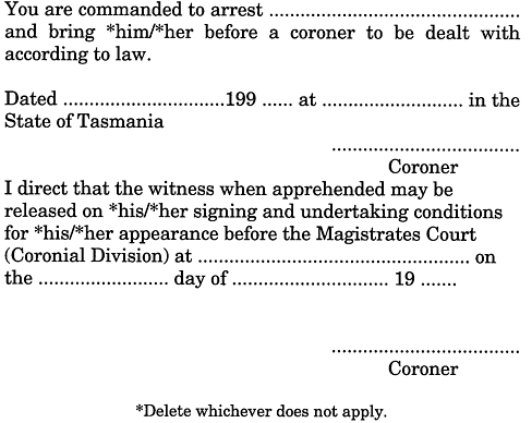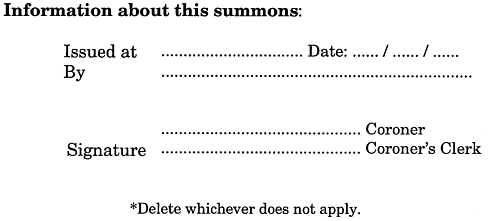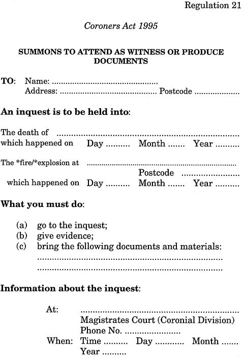 (1) A summons under section 53(1) of the Act requiring a person to attend an inquest as a witness or to produce at an inquest any document or other materials is to be in accordance with Form 8.(2) A summons (a) is to be served personally; or(b) may be served by leaving it at the person's usual place of abode or business with a person over the age of 18 years.(3) A person serving a summons is to (a) endorse a copy of the summons with the date and place of service; and(b) sign the endorsement.(4) In any proceeding for a failure to comply with a summons a copy of the summons endorsed in accordance with subregulation (3) is evidence (a) that the endorsement was signed by the person whose signature it purports to be; and(b) that any statement contained in the endorsement is true.