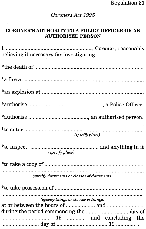An authority issued by a coroner under section 59(3) of the Act is to be (a) in writing; and(b) in accordance with Form 10 .