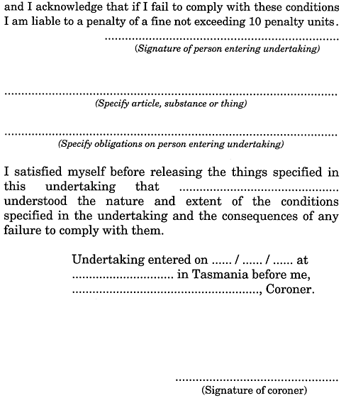 (1) An application for an order under section 60 of the Act is to (a) be in writing; and(b) specify the reasons the order is sought.(2) An order under section 60 of the Act releasing any article, substance or thing (a) may be made subject to any condition specified in the order; and(b) is to be made in accordance with Part 1 of Form 11 .(3) Any person who receives any article, substance or thing consequent on an order under section 60 of the Act must undertake to comply with any condition specified in the order.(4) An undertaking is to be (a) in writing; and(b) in accordance with Part 2 of Form 11 .(5) Any person who fails to comply with a condition specified in an order under section 60 of the Act releasing any article, substance or thing is guilty of an offence.Penalty: Fine not exceeding 10 penalty units.