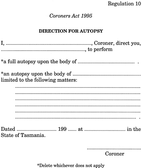 A direction by a coroner that an autopsy be performed is to (a) be in writing; and(b) specify whether a full or limited autopsy is to be performed; and(c) be in accordance with Form 2 .