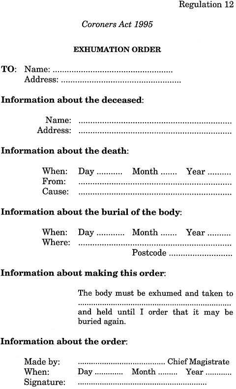 (1) An exhumation order is to be (a) in writing; and(b) in accordance with Form 3.(2) The Chief Magistrate is to cause a copy of the order to be served on the Minister administering the Local Government Act 1993 .