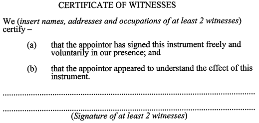 (1) [Section 32 Subsection (1) amended by No. 4 of 2000, s. 8, Applied:28 Apr 2000] A person who is of or over the age of 18 years may, by instrument in writing, appoint a person as his or her enduring guardian and any such instrument may appoint 2 or more persons to act jointly as enduring guardians.(2) An instrument is not effective to appoint an enduring guardian unless (a) it is in accordance with Form 1 in Schedule 3 or in a form to similar effect; and(b) [Section 32 Subsection (2) amended by No. 4 of 2000, s. 8, Applied:28 Apr 2000] there is endorsed on it an acceptance in the form or to the effect of the acceptance specified in Form 1 signed by each person appointed as an enduring guardian; and(c) there are at least 2 attesting witnesses to the instrument neither of whom is a party to it nor a relative of a party to it and who have witnessed the instrument in the presence of the appointor and each other; and(d) it is registered with the Board.(3) A person is not eligible to be appointed as an enduring guardian unless he or she is of or over the age of 18 years.(4) A person is not eligible to be appointed as an enduring guardian if he or she is, in a professional or administrative capacity, directly or indirectly responsible for, or involved in, the medical care or treatment of the appointor and, if a person who is validly appointed as an enduring guardian becomes so responsible or involved, the appointment lapses.(5) [Section 32 Subsection (5) amended by No. 4 of 2000, s. 8, Applied:28 Apr 2000] Subject to any conditions specified in the instrument, an instrument appointing an enduring guardian authorizes each appointee to exercise the powers of a guardian under section 25 if the appointor subsequently becomes unable by reason of a disability to make reasonable judgements in respect of matters relating to his or her personal circumstances.(6) The powers conferred by an instrument appointing an enduring guardian are, unless the Board otherwise directs, to be exercised in accordance with any lawful directions specified in the instrument.