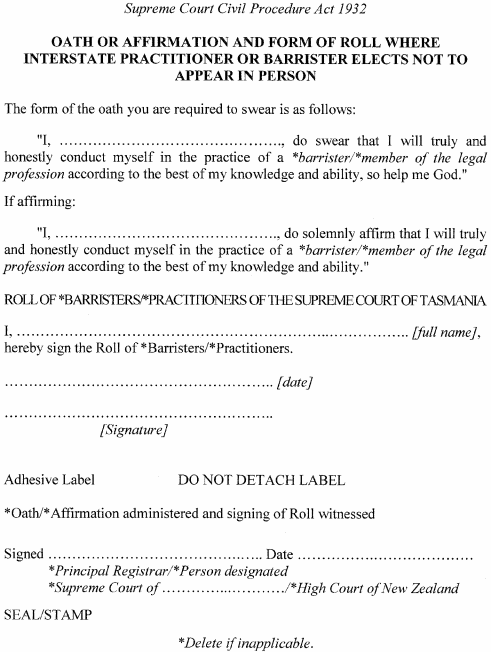 Form 1 | Title, heading and footer | Form 2 | Writ | Form 3 | Originating application intended to be served | Form 4 | Originating application requiring an appearance intended to be served out of the State | Form 5 | Originating application not intended to be served | Form 6 | Notice to be given to persons ordered to be served with notice of an application | Form 6A | Notice to defendant served outside Australia | Form 7 | Notice of change or appointment of practitioner | Form 8 | Notice of change of agent | Form 9 | Notice of party acting in person | Form 10 | Notice of change of address for service | Form 11 | Notice of intention to cease to act as practitioner | Form 12 | Notice of ceasing to act as practitioner | Form 13 | Letter of request for service of document | Form 14 | Notice of appearance | Form 15 | Notice of conditional appearance | Form 16 | Notice of appearance limited as to land | Form 17 | Notice of counterclaim [or cross-application] | Form 18 | Third party notice | Form 19 | Judgment for plaintiff after confession of defence | Form 20 | Notice of payment into court | Form 21 | Acceptance of sum paid into court | Form 22 | Affidavit for entry of appearance as litigation guardian | Form 23 | Judgment by consent | Form 24 | Notice of discontinuance or finalisation | Form 25 | Judgment for defendant on discontinuance | Form 26 | List of documents | Form 27 | Affidavit verifying list of documents | Form 28 | Receiver's recognisance | Form 29 | Receiver's bond | Form 30 | Receiver's security by undertaking | Form 31 | Affidavit verifying receiver's account | Form 32 | Short order for issue of commission to examine witnesses | Form 33 | Long order for commission to examine witnesses | Form 34 | Commission to examine witnesses | Form 35 | Order for letter of request to judicial authority out of Tasmania | Form 36 | Letter of request for examination of witness | Form 37 | Subpoena | Form 41 | Interlocutory application | Form 42 | Certificate of readiness | Form 43 | Notice of intention to appear | Form 44 | Notice of submission | Form 45 | Writ of certiorari | Form 46 | Writ of mandamus | Form 47 | Writ of prohibition | Form 48 | Notice of discontinuance of appeal | Form 49 | Citation to see proceedings | Form 50 | Citation to bring in grant | Form 51 | Writ and statement of claim in action at the suit of the Attorney-General for forfeiture | Form 52 | Notice of filing of writ and statement of claim for condemnation of property seized as forfeited | Form 53 | Claim as to property seized | Form 54 | Judgment in default of claim | Form 55 | Judgment of forfeiture where claim filed but no defence filed | Form 56 | Judgment of forfeiture where trial had | Form 57 | Judgment for claimant | Form 57A | Notice of intention to appear upon return of application | Form 57B | Notice of submission to order upon return of application | Form 57BA | Notice of intention to apply for admission | Form 57BB | Affidavit in support of application for admission (Local Applicants or Qualified Overseas Applicants) | Form 57BC | Affidavit as to character | Form 57BD | Affidavit in support of application for admission (Overseas Practitioner) | Form 57BE | Affidavit in support of application for declaration of suitability | Form 57BF | Affidavit of service on Legal Profession Board and Law Society | Form 57BG | Oath for barristers and members of legal profession | Form 57C | Notice of intention to apply for admission by interstate practitioner | Form 57D | Certificate of compliance with Commonwealth Act | Form 57E | Oath or affirmation and form of roll where interstate practitioner or barrister elects not to appear in person | Form 58 | Final judgment in default of appearance or defence | Form 59 | Interlocutory judgment in default of appearance or defence | Form 60 | Judgment after trial with jury | Form 61 | Judgment after trial without jury or in accordance with an order | Form 62 | General form of order | Form 63 | Writ of fieri facias | Form 64 | Writ of veditioni exponas | Form 65 | Writ of possession | Form 66 | Writ of restitution | Form 67 | Writ of delivery | Form 68 | Writ of delivery or assessed value | Form 69 | Affidavit and application for provisional garnishee order attaching a debt | Form 70 | Provisional garnishee order attaching a debt (incorporating notices to debtor garnishee) | Form 71 | Final garnishee order attaching debt where garnishee has paid amount owing into court | Form 72 | Final garnishee order attaching debt | Form 73 | Affidavit and application for provisional garnishee order attaching earnings | Form 74 | Provisional garnishee order attaching earnings (incorporating notices to debtor and garnishee) | Form 75 | Final garnishee order attaching earnings | Form 76 | Affidavit as to stock | Form 77 | Notice as to stock | Form 78 | Writ of attachment | Form 79 | Writ of sequestration | Form 80 | Advertisement for creditors | Form 81 | Advertisement for claimants other than creditors | Form 82 | Notice to creditors or other claimants to produce documents | Form 83 | Affidavit of service of foreign process | Form 84 | Certificate as to examination and depositions |