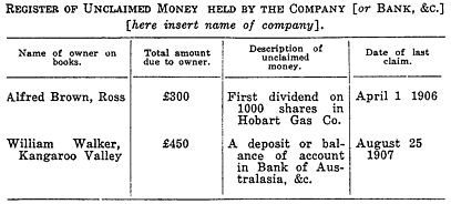 [Section 3 Amended by 25 Geo. V No. 78 ](1) [Section 3 Subsection (1) amended by No. 17 of 1996, Applied:14 May 1998] It shall be the duty of every company, in the month of January in each year to enter all unclaimed moneys of not less than six dollars in any one account in an alphabetical register to be made up to the thirty-first day of December last preceding, and kept by such company at its head or principal office in this State, in form I in the schedule , and with the particulars therein specified.(2) [Section 3 Subsection (2) amended by No. 17 of 1996, Applied:14 May 1998] After the last day of January in each year such register shall be open to the inspection of all persons at such head or principal office during the hours within which the company transacts its ordinary business, on payment of a fee of ten cents.