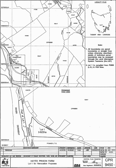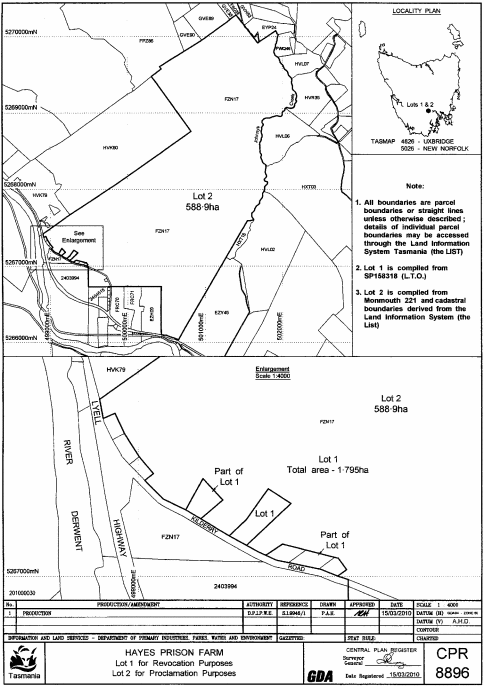 SCHEDULE 1 - Hayes Prison FarmThose premises (not including Lot 1) comprising about 588.9 hectares, shown as Lot 2 and bounded by a heavy black line on Plan 8896 in the Central Plan Register, a reduced copy of which is set out, by way of illustration only, in Schedule 3 to this proclamation.