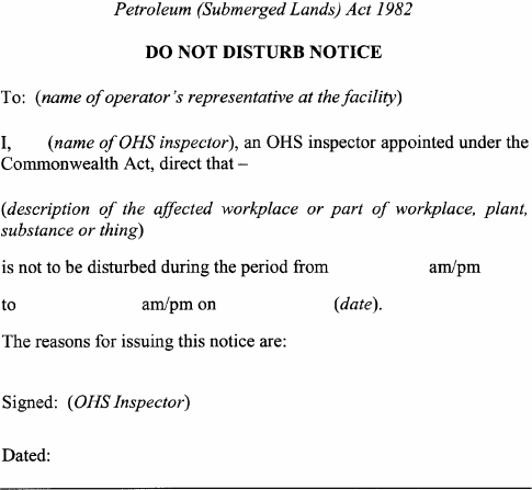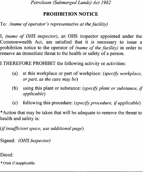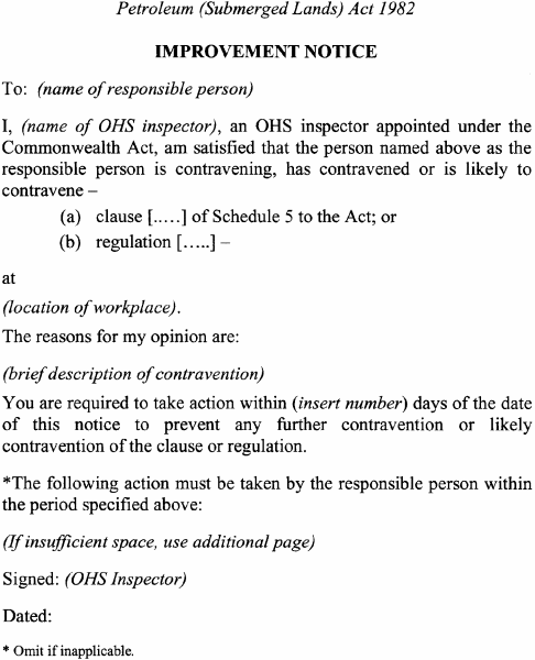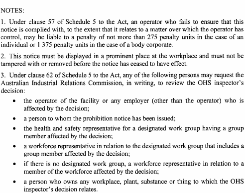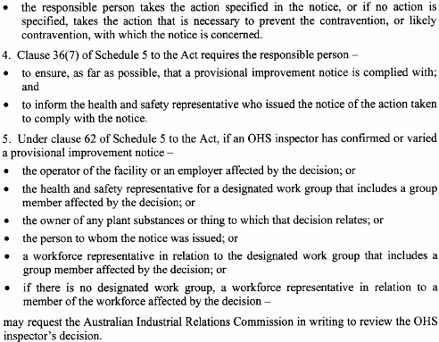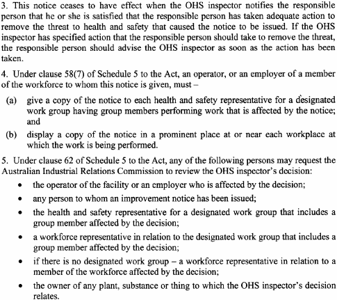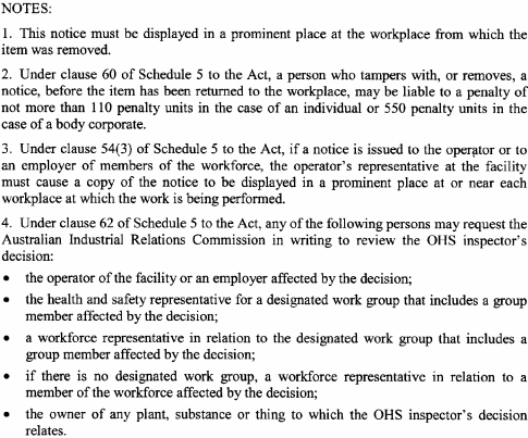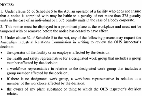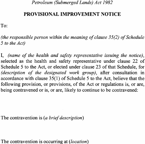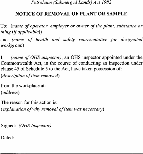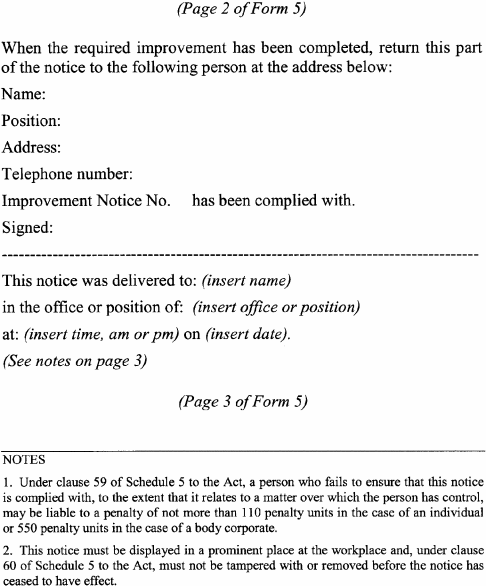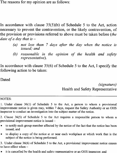A notice issued by an elected health and safety representative or OHS inspector under any of the following provisions of Schedule 5 to the Act must be in accordance with the form specified in relation to the provision concerned:(a) clause 35(2) (provisional improvement notices) Form 1 ;(b) clause 54(2) (power to take possession of plant, take samples of substances etc) Form 2 ;(c) clause 55(2) (power to direct that workplace etc not be disturbed) Form 3 ;(d) clause 56(1) (power to issue prohibition notices) Form 4 ;(e) clause 58(1) (power to issue improvement notices) Form 5 .