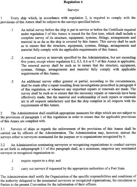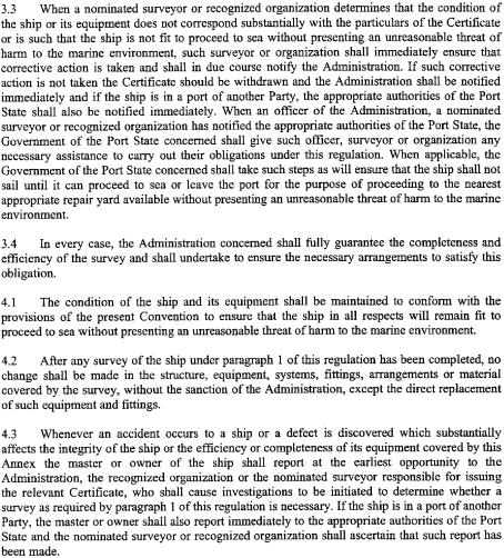(1)  The owner of a ship in respect of which a ship construction certificate issued under section 43 is in force shall, at least once during each period that is a prescribed period in relation to the ship for the purposes of this section, cause the ship to be surveyed for the purpose of ensuring its compliance with the provisions of Annex I .