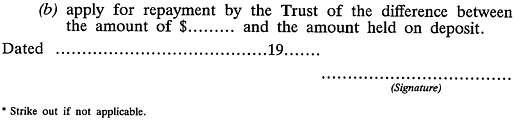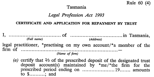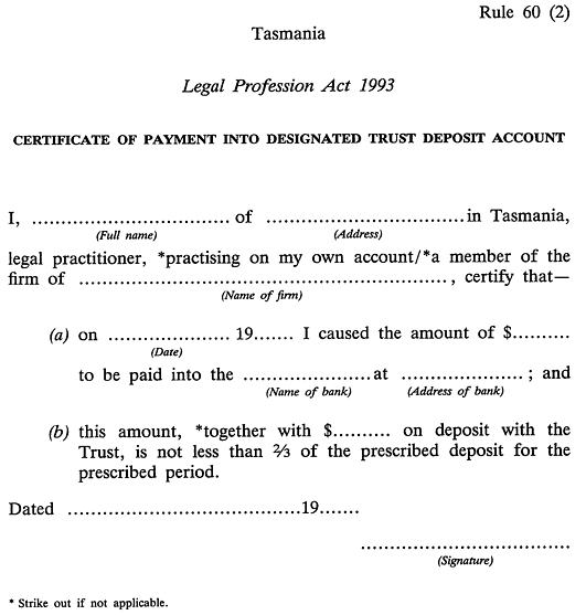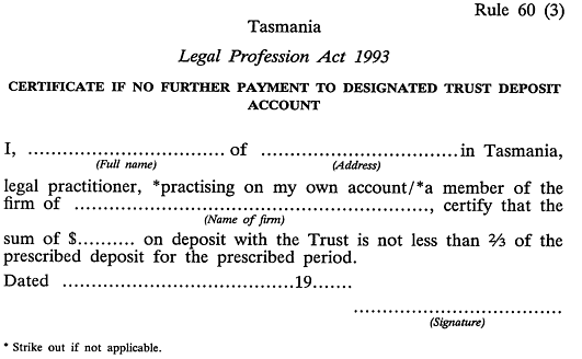 (1) A designated trust deposit account is to be (a) with a bank's head office in Hobart; and(b) entitled "The Solicitors' Trust Solicitors' Deposit Account".(2) A firm, on making a payment out of its trust bank account into a designated trust deposit account under section 102(1) of the Act, must provide the Trust with a certificate in accordance with Form 1 of Schedule 2 .(3) If a firm is not required to pay any further amount into a designated trust deposit account under section 102(1) of the Act, it must provide the Trust with a certificate in accordance with Form 2 of Schedule 2 .(4) A firm requiring repayment of an amount by the Trust under section 102(4) of the Act must provide the Trust with a certificate and application in accordance with Form 3 of Schedule 2 .