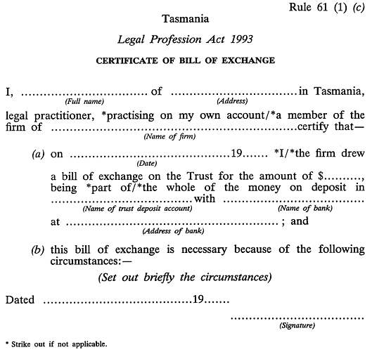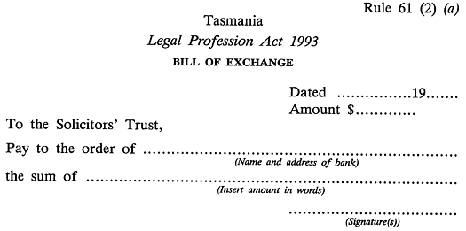 (1) A firm drawing a bill of exchange on the Trust under section 103(1) of the Act must (a) complete and present the bill of exchange to the bank with which the firm maintains its trust bank account; and(b) pay the money received by it under the bill of exchange into the firm's trust bank account; and(c) provide the Trust with a certificate in accordance with Form 4 of Schedule 2 .(2) A bill of exchange is to be (a) in accordance with Form 5 of Schedule 2 ; and(b) signed by each member of the firm presenting it.(3) A bill of exchange is not required to be signed by each member of the firm presenting it if, before drawing the bill of exchange, the firm provides an authority specifying the method of signing it to (a) the Trust; and(b) the bank to which it is to be presented.(4) An authority is to be signed by each member of the firm.(5) A person signing an authority is bound by the bill of exchange to which the authority relates.