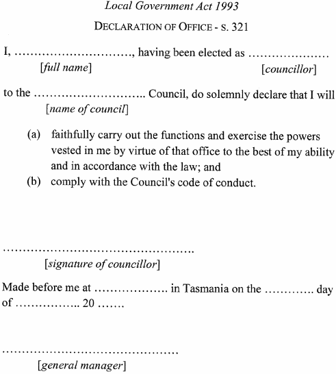 (1) For the purpose of section 321 of the Act, a person elected as a councillor must complete the declaration set out in Schedule 2 , read the completed declaration in the presence of the general manager and sign the declaration.(2) The general manager is to sign the declaration as witness.
