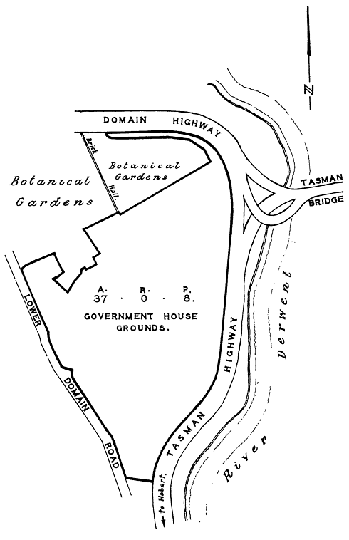 37 A. 8P. | Government House Grounds. | Commencing at a point distant 16 feet 4½ inches south-easterly from State permanent mark Number 11 on the Lower Domain Road and bounded on the south-west and north-west by 796 feet 10 inches north-westerly and north-easterly in several bearings along that road again on the south-west and on the west by 760 feet 6¾ inches north-westerly and northerly in several bearings again along that road on the north-east and again on the north-west by 245 feet 1¾ inches south-easterly and north-easterly in several bearings along land vested in the Botanical Gardens Board within the meaning of the Royal Tasmanian Botanical Gardens Act 2002 again on the north-east by 144 feet 9¼ inches south-easterly in two bearings again along that land on the south-east by 82 feet 1½ inches south-westerly in two bearings again along that land again on the north-east by 123 feet 5 inches south-easterly again along that land again on the north-west and again on the north-east by 278 feet 8 inches north-easterly and south-easterly in several bearings again along that land again on the south-west by 39 feet 11¼ inches north-westerly again along that land again on the north-west by 49 feet 11¾ inches north-easterly again along that land again on the south-west by 175 feet 11¼ inches north-westerly again along that land again on the north-west by 254 feet 7½ inches north-easterly again along that land again on the north-east by 10 inches south-easterly again along that land again on the north-west by 675 feet 11¼ inches north-easterly again along that land again on the south-west and on the south by 764 feet ¼ inch north-westerly and westerly in several bearings again along that land to the Northern Outlet Road on the north again on the north-east and again on the south-east by 3 041 feet 11¼ inches easterly south-easterly and south-westerly in several bearings along the Northern Outlet Road aforesaid and along the Tasman Highway and thence again on the south-west by 171 feet 1½ inches north-westerly along part of the Queens Domain (occupied by Police Department) to the point of commencement, being the area of land shown on Plan Number 965 filed and registered in the office of the Surveyor-General and Secretary for Lands at Hobart and delineated on the plan set forth in Schedule 2 and therein bounded by heavy black lines. |