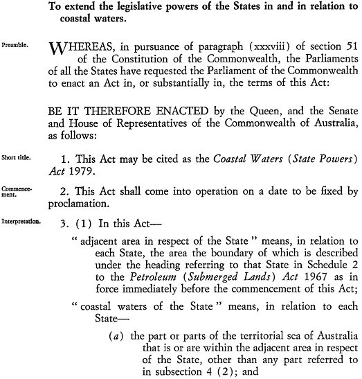 Whereas it has been agreed between the Government of the Commonwealth and the Governments of the States of Australia that the legislative powers of the States in and in relation to the coastal waters should be extended by an Act of the Parliament of the Commonwealth enacted at the request of the Parliaments of the States in pursuance of paragraph (xxxviii) of section 51 of the Constitution of the Commonwealth of Australia :