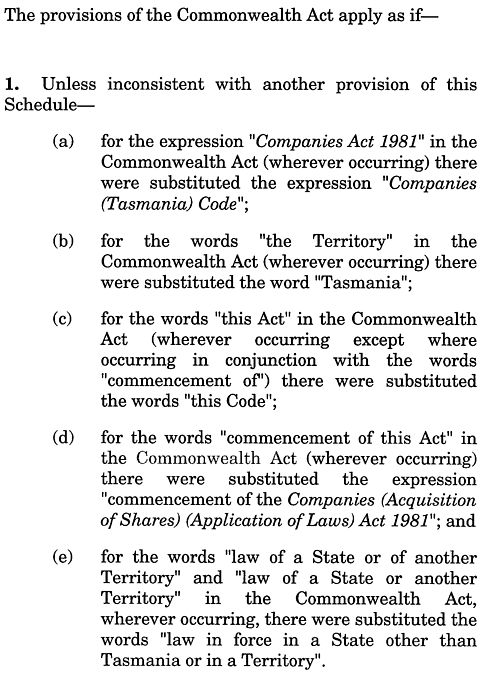 Subject to this Act, the provisions of the Commonwealth Act (other than sections 1, 2, 3, 4, and 5) apply as laws of Tasmania.(a) as if amended as set out in Schedule 1 ; and(b) subject to and in accordance with the Companies and Securities (Interpretation and Miscellaneous Provisions) (Application of Laws) Act 1981