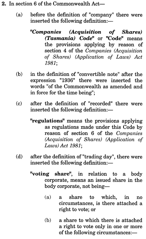An Act relating to the application of laws to regulate the acquisition of shares in companies incorporated in Tasmania and matters connected therewith, to amend the Companies Act 1962, and for other purposes