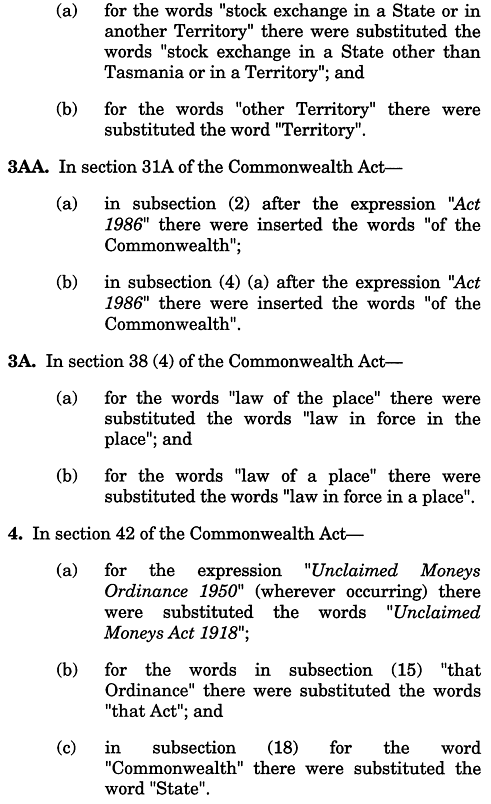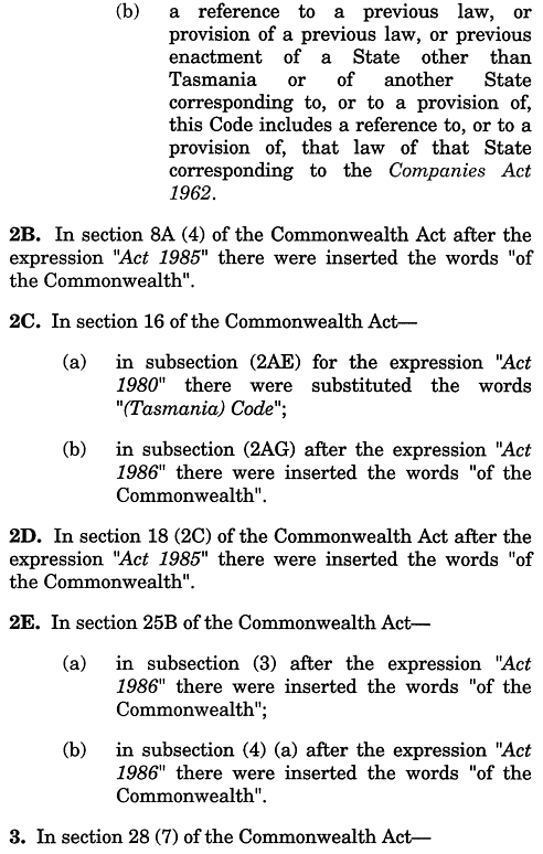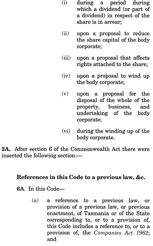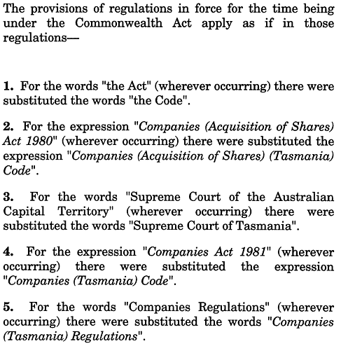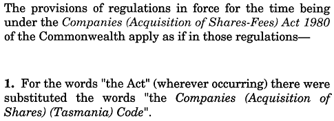 (1) Unless the contrary intention appears, in this or any other Act or in a regulation or other instrument made under this or any other Act or in any other document made by or under the authority of, or for the purposes of, a law of Tasmania (a) a reference to the Companies (Acquisition of Shares) (Tasmania) Code is a reference to the provisions of the Commonwealth Act applying by reason of section 4 ;(b) a reference to a provision of that Code is a reference to the corresponding provision of the Commonwealth Act as so applying;(c) a reference to the Companies (Acquisition of Shares) (Tasmania) Regulations is a reference to the provisions of regulations in force under the Commonwealth Act applying by reason of section 6 ;(d) a reference to a provision of those regulations is a reference to the corresponding provision of the regulations in force under the Commonwealth Act as so applying;(e) a reference to the Companies (Acquisition of Shares-Fees) (Tasmania) Regulations is a reference to the Schedule to regulations prescribing fees under the Companies (Acquisition of Shares-Fees) Act 1980 of the Commonwealth as referred to in section 9 ; and(f) a reference to a provision of that Schedule is a reference to the corresponding provision of the Schedule to regulations in force under that Act as referred to in section 9 .(2) In subsection (1) , provision includes Part, Division, section, subsection, paragraph, subparagraph, Schedule, form, regulation, clause, subclause, or other division.