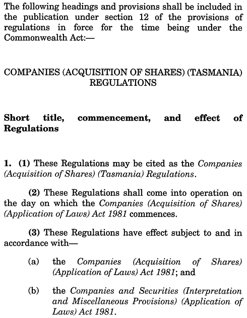 (1) The Minister may from time to time authorize the publication by the Government Printer of the provisions of regulations under the Commonwealth Act (other than provisions providing for the citation or commencement of the regulations) amended as set out in Schedule 2 and in operation, or to come into operation, in Tasmania.(2) A document published under subsection (1) (a) shall include the headings and provisions set out in Schedule 5 ;(b) shall include a notification of the date, or dates, on which the several provisions set out in the document came, or come, into operation in Tasmania;(c) shall include a statement of the date on which the Minister authorized the publication; and(d) may be cited as the Companies (Acquisition of Shares) (Tasmania) Regulations.(3) A document that is or purports to be a copy of the Companies (Acquisition of Shares) (Tasmania) Regulations that has been, or purports to have been, published in accordance with this section is prima facie evidence of the provisions applying by reason of section 6 as in operation, or to come into operation, in Tasmania as notified in the document in accordance with paragraph (b) of subsection (2) .
