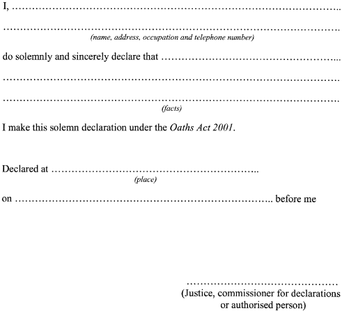 (1) Any justice or other person by law authorised to administer an oath or a commissioner for declarations may take and receive the voluntary declaration of a person.(2) A declaration is to be in accordance with Form 1 as specified in Schedule 1 .(3) If, under any Act, a declaration or document is authorised or required to be made or signed before a justice, it is sufficient if that declaration or document is made or signed before a commissioner for declarations.