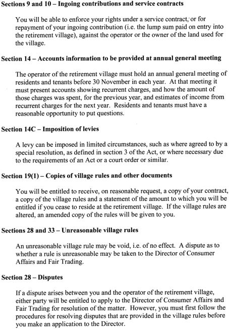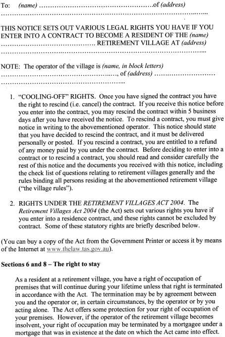 YOU SHOULD READ THIS DOCUMENT CAREFULLY | ENTRY INTO A RETIREMENT VILLAGE USUALLY INVOLVES A SIGNIFICANT CAPITAL COMMITMENT AND MAY CHANGE YOUR LIFESTYLE | THESE QUESTIONS SHOULD ASSIST YOU TO MAKE AN INFORMED DECISION | IF YOU ARE UNCERTAIN ABOUT ANY ASPECTS OF THE VILLAGE OR THE DOCUMENTS YOU HAVE RECEIVED FROM THE VILLAGE, SEEK INDEPENDENT ADVICE | General | Have I discussed fully my decision to enter a retirement village with my family, friends, a social worker or a relevant independent advisory body working in the industry? | What discussions have I had with residents of the retirement village I have chosen? | Will the lifestyle of the village (including social activities and religion) suit me? | What are the rules with regard to having someone else live with me? | What system does the village have for resolving disputes? | Are the residents actively involved in making village rules? | Legal Implications | Have I sought advice on the documents relating to the village from an Australian legal practitioner, Tasmania Legal Aid or some other appropriate source? | Under what conditions can I be moved from my place of residence to another part of the village? | How can the operator terminate my occupation? | Is my long-term occupation at the village secure? | What protection do I have if the village is sold to some other organisation? | Financial Matters | Am I aware of, and can I afford to pay, the ingoing contribution (if applicable), the regular recurrent charges and any extraordinary charges which can be imposed on me? | What arrangements can be made if I can't meet future charges? | How do the terms and amount of repayment of my ingoing contribution compare with other villages? | When do I get access to my money after I leave the village? | Are the residents actively involved in decisions concerning the level of maintenance and services provided, their cost, and how these costs are to be varied in the future? | What are the restrictions on the sale of my residential premises? | What say do I have in deciding the sale price? | Building and Construction | Have the community facilities of the village been built? If not, what guarantee do I have that they will ever be constructed? | Do I have any say in the design, construction and furnishing of my residential premises if construction is not yet complete? | Will the residential premises, building and site be accessible if I become disabled and need a wheelchair or walking aid? If not, can modifications be made easily? | Health and Welfare | What services specially designed for the elderly does the village provide, e.g. nursing care, access to nursing care, an emergency call system? Do these services meet my present needs and what I expect will be my future needs? | What financial and accommodation alternatives do I have if I become too frail to live in these residential premises? | Activities and Amenities | What are the restrictions on the use of my residential premises and the village facilities? | How will I have to adapt and alter my existing lifestyle to comply with the regulations and restrictions of life in the village? | What type of public, private or village transport is available? | Are pets permitted? | How accessible are the local shops to my present and future needs? |