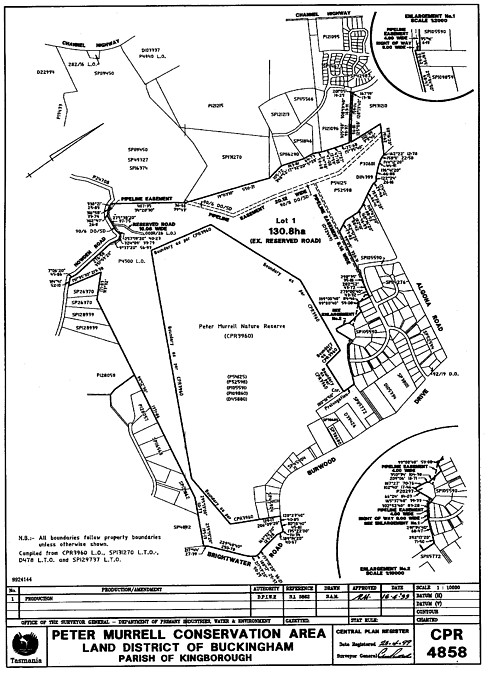 SCHEDULE 1 - Peter Murrell Conservation AreaAll that area of Crown land in the land district of Buckingham, parish of Kingborough comprising about 130.8 hectares and shown as Lot 1 on Plan 4858 in the Central Plan Register, a reduced copy of which is set out, by way of illustration only, in Schedule 2 to this proclamation.