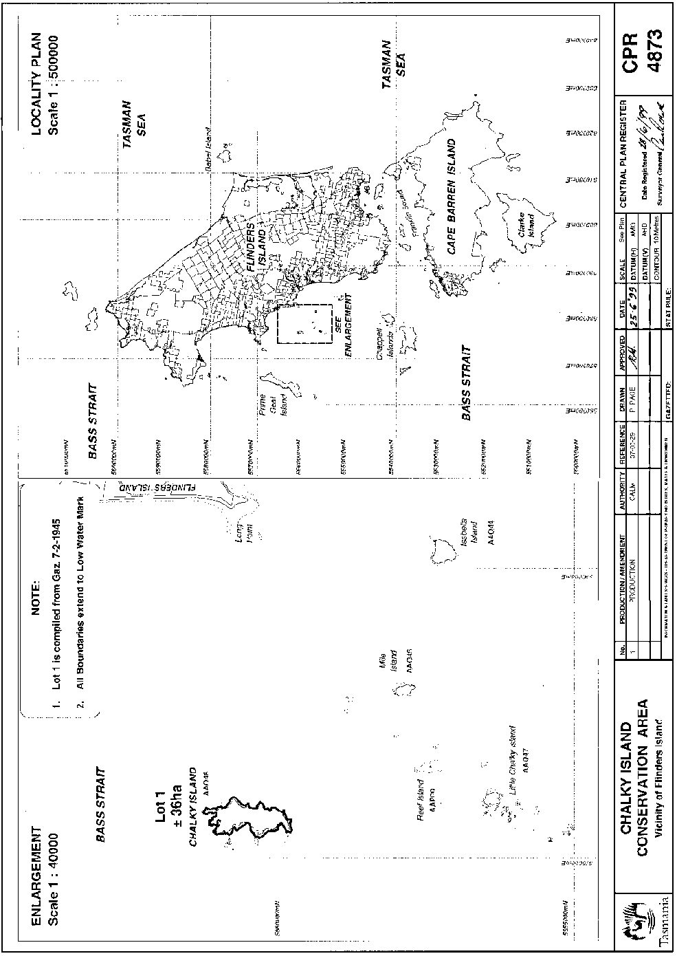 SCHEDULE 1 - Chalky Island Conservation AreaAll that area of land comprising about 36 hectares shown bounded by a heavy black line on Plan Number 4873 in the Central Plan Register, a reduced copy of which is set out, by way of illustration only, in Schedule 2 to this proclamation.