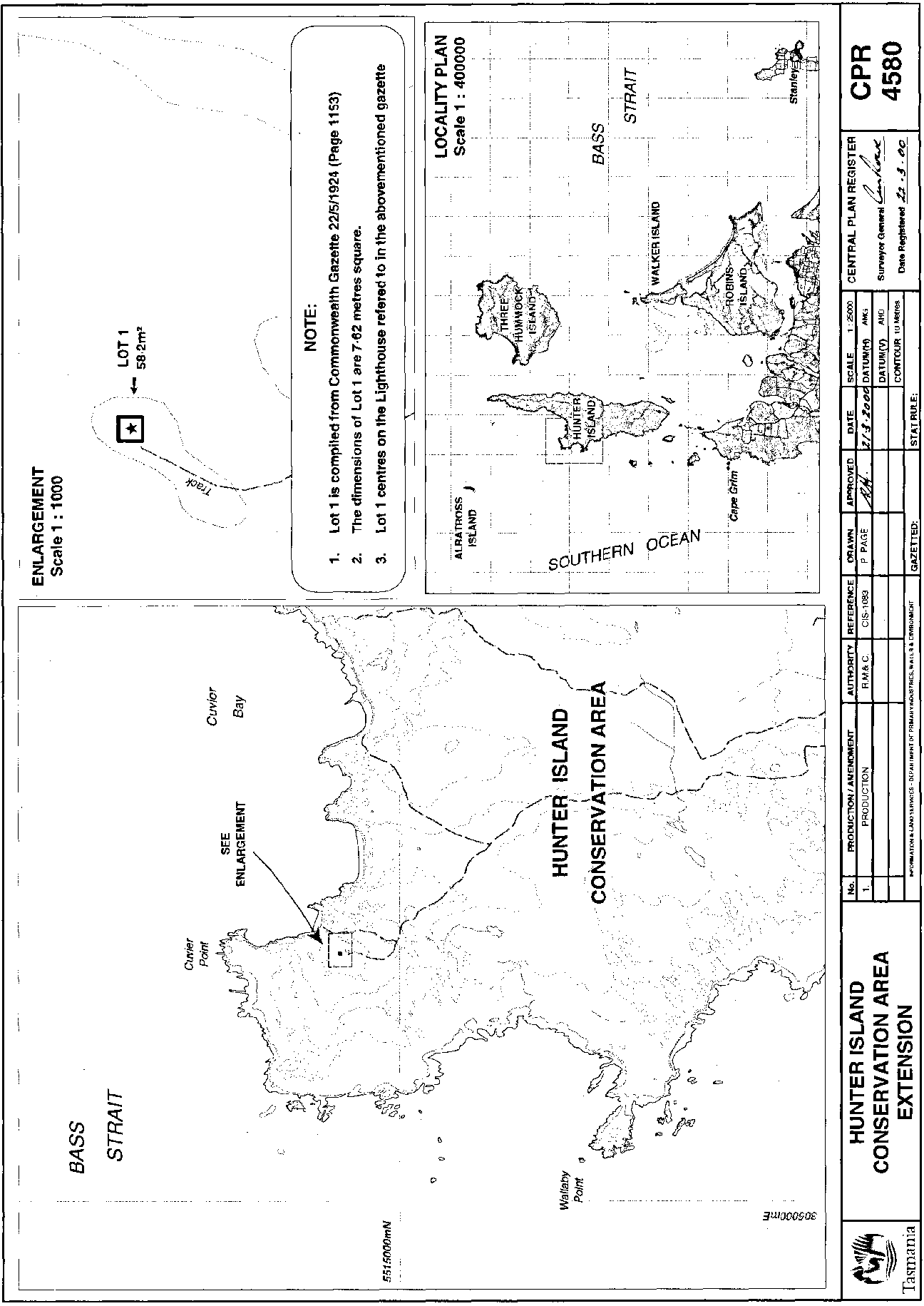 SCHEDULE 1 - Extension of Hunter Island Conservation AreaAll that area of land comprising about 58.2 square metres shown bounded by a heavy black line on Plan Number 4580 in the Central Plan Register a reduced copy of which is set out, by way of illustration only, in Schedule 2 to this proclamation.