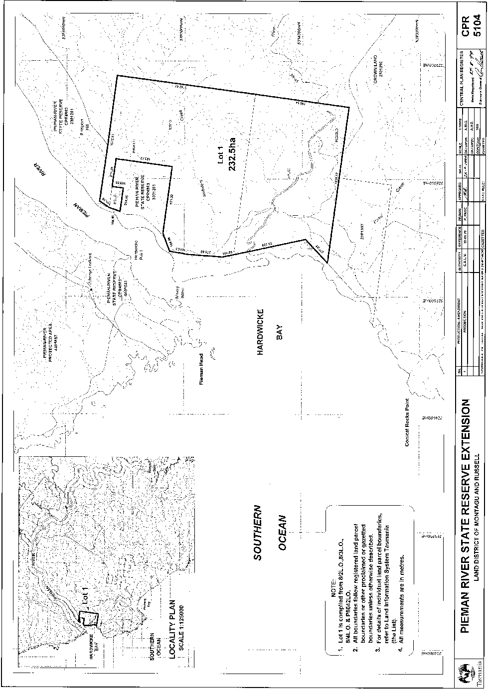 SCHEDULE 1 - Pieman River State ReserveAll that area of land comprising about 232.5 hectares shown bounded by a heavy black line on Plan Number 5104 in the Central Plan Register, a reduced copy of which is set out, by way of illustration only, in Schedule 2 to this proclamation.