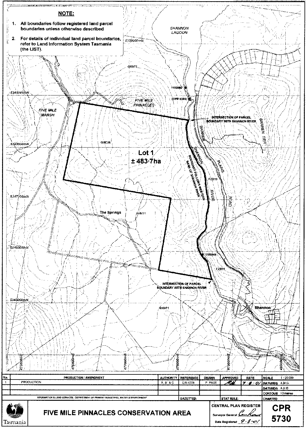 PART 2 - Five Mile Pinnacles Conservation AreaAll that area of land comprising about 483.7 hectares shown bounded by a heavy black line on Plan Number 5730 in the Central Plan Register a reduced copy of which is set out, by way of illustration only, in Part 2 of Schedule 2 to this proclamation.