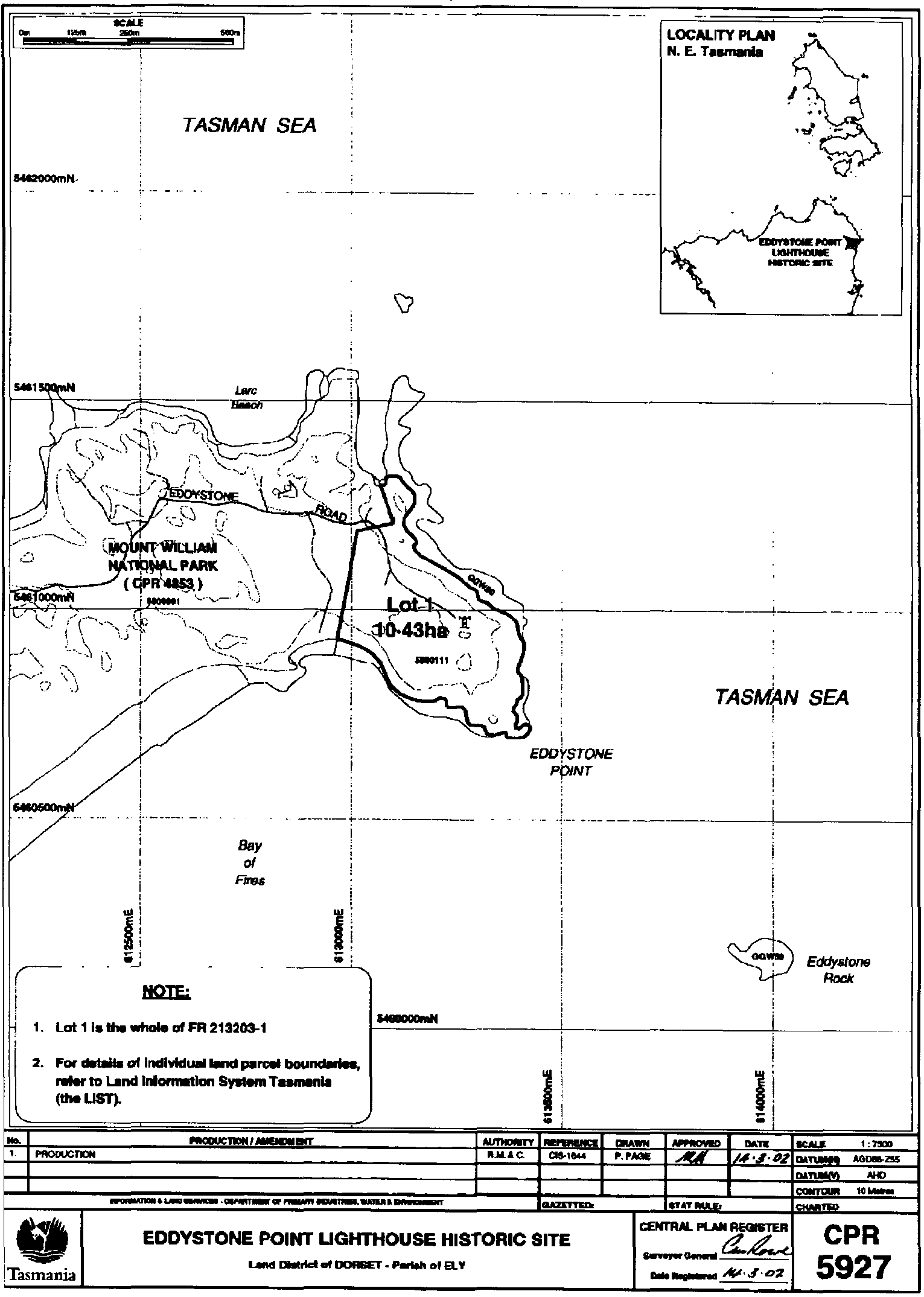 SCHEDULE 1 - Eddystone Point Lighthouse Historic SiteAll that area of land comprising about 10.43 hectares as shown bounded by a heavy black line on Plan No. 5927 in the Central Plan Register, a reduced copy of which is set out, by way of illustration only, in Schedule 2 to this proclamation.