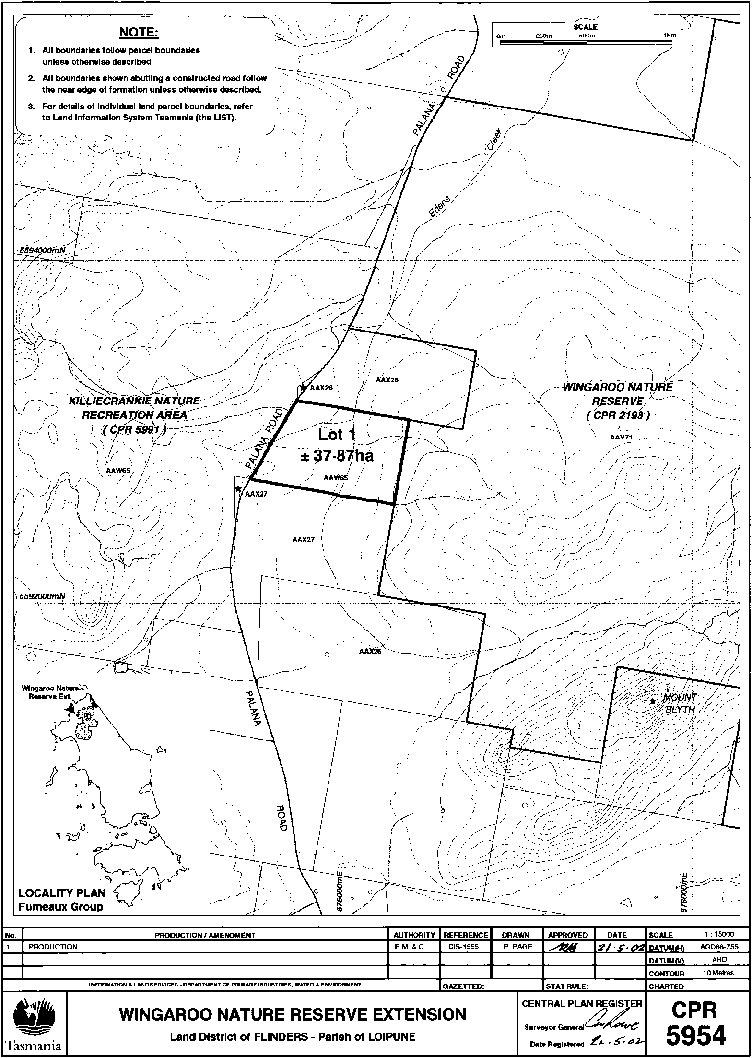 PART 1 - Wingaroo Nature ReserveAll that area of land comprising about 38 hectares shown bounded by a heavy black line on Plan Number 5954 in the Central Plan Register, a reduced copy of which is set out, by way of illustration only, in Part 1 of Schedule 2 to this proclamation.