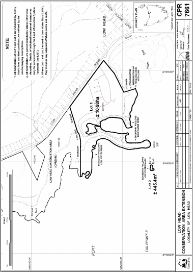 SCHEDULE 1 - LOW HEAD CONSERVATION AREAAll those areas of land comprising about 11.02 hectares, shown as Lots 1 and 2 bounded by heavy black lines on Plan 7661 in the Central Plan Register, a reduced copy of which is set out, by way of illustration only in Schedule 2 to this proclamation.