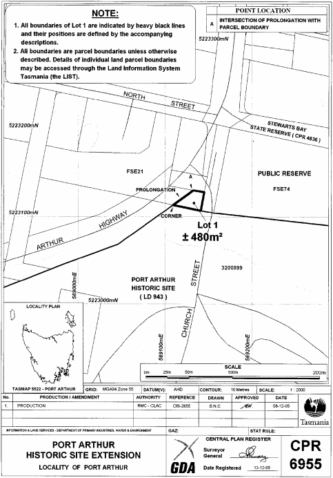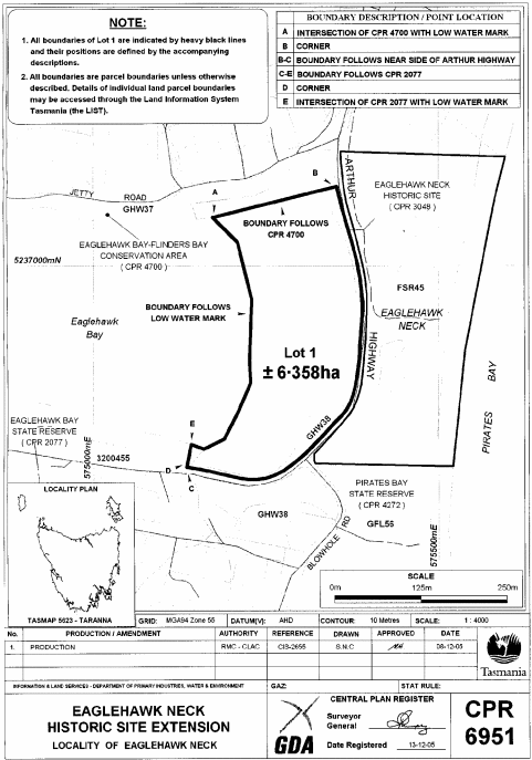 PART 2 - EAGLEHAWK NECK HISTORIC SITEAll that area of land comprising about 6.358 hectares, shown as Lot 1 and bounded by a heavy black line on Plan 6951 in the Central Plan Register, a reduced copy of which is set out, by way of illustration only, in Part 3 of Schedule 2 to this proclamation.