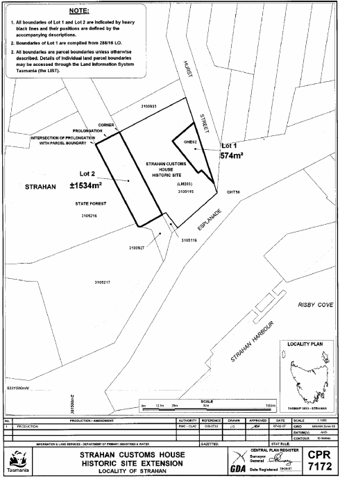 PART 5 - STRAHAN CUSTOMS HOUSE HISTORIC SITEAll that area of land comprising about 2 108 square metres, shown as Lots 1 and 2 and bounded by heavy black lines on Plan 7172 in the Central Plan Register, a reduced copy of which is set out, by way of illustration only, in Part 6 of Schedule 2 to this proclamation.