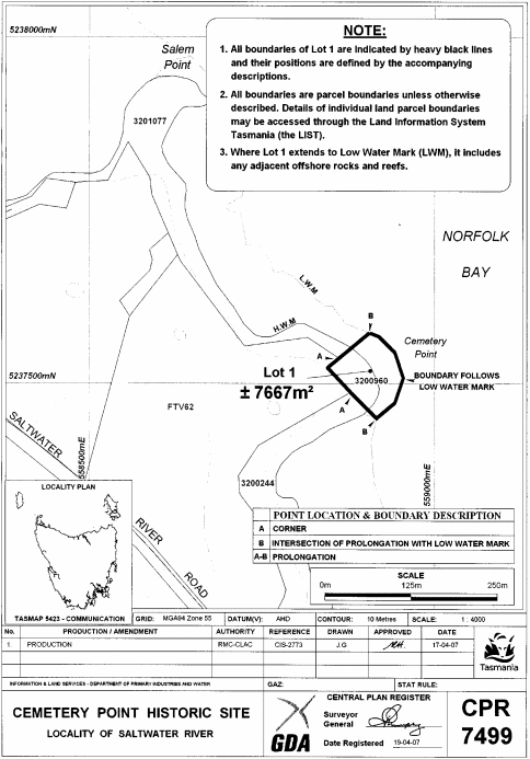 PART 3 - CEMETERY POINT HISTORIC SITEAll that area of land comprising about 7 667 square metres, shown as Lot 1 and bounded by a heavy black line on Plan 7499 in the Central Plan Register, a reduced copy of which is set out, by way of illustration only, in Part 4 of Schedule 2 to this proclamation.