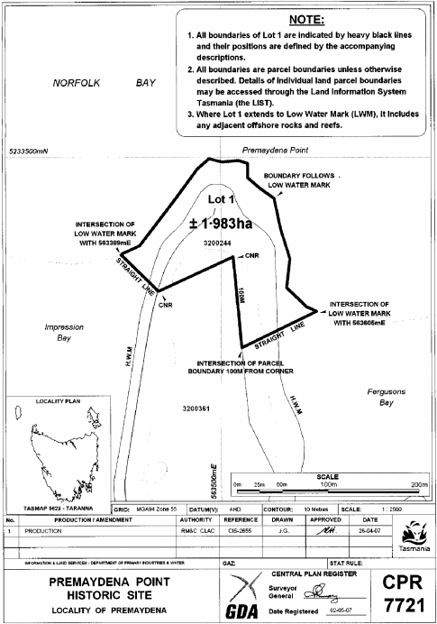PART 4 - PREMAYDENA POINT HISTORIC SITEAll that area of land comprising about 1.983 hectares, shown as Lot 1 and bounded by a heavy black line on Plan 7721 in the Central Plan Register, a reduced copy of which is set out, by way of illustration only, in Part 5 of Schedule 2 to this proclamation.